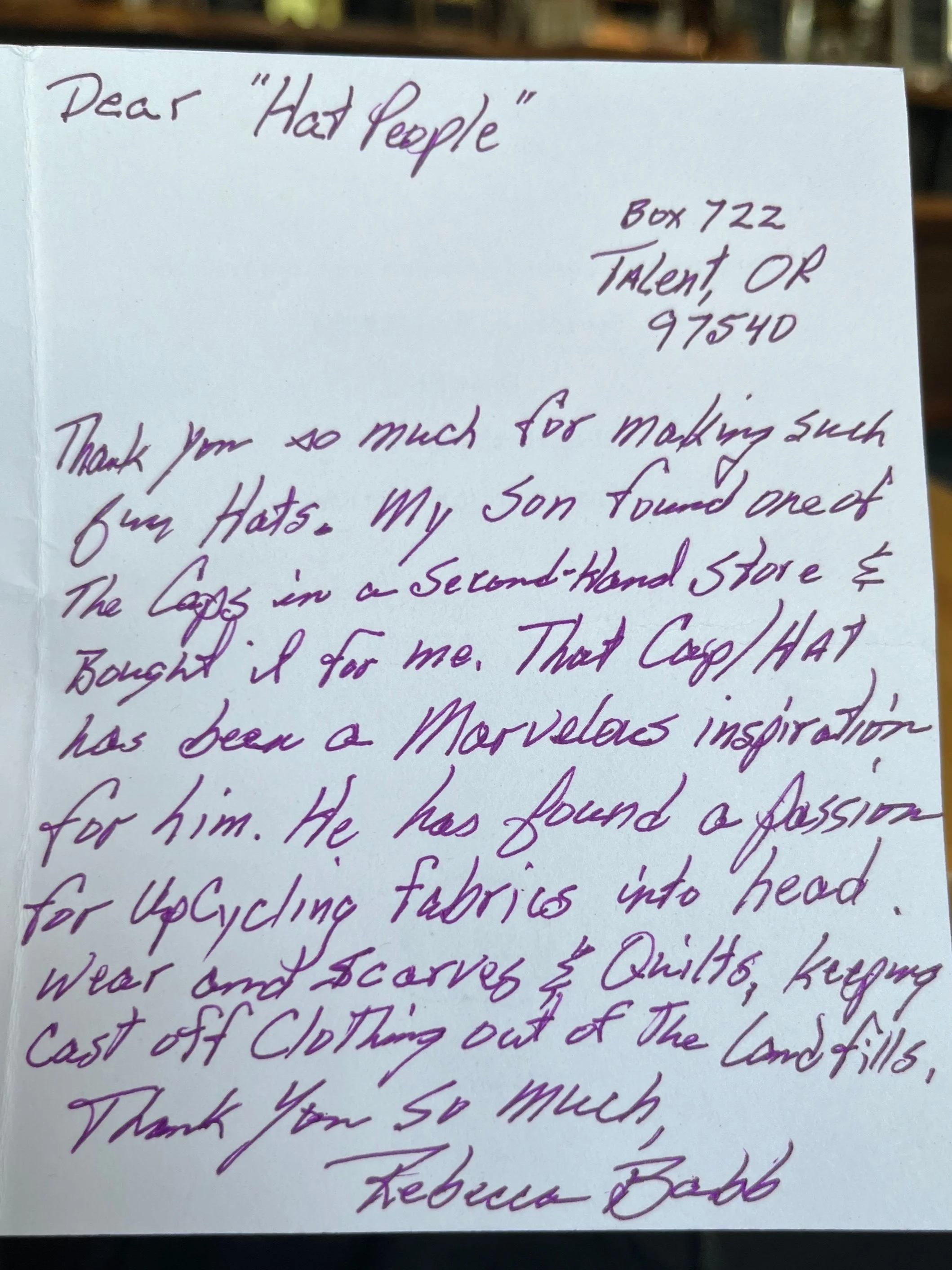 Along with the link for Tim’s shop above, the two pictures depict a very special hat story that came to us this year. A young man found one of our hats in a second hand store and it inspired him to start working in upcycle fashion. Wonderful. Although 95% of our fabrics are new, the origins of Hat People are strongly with the current inspirations of this young man. There is so much free/cheap/available/under-appreciated fabric kicking around in the form of old clothing. Make a new thing or two people, and remember, sewing machines love you.