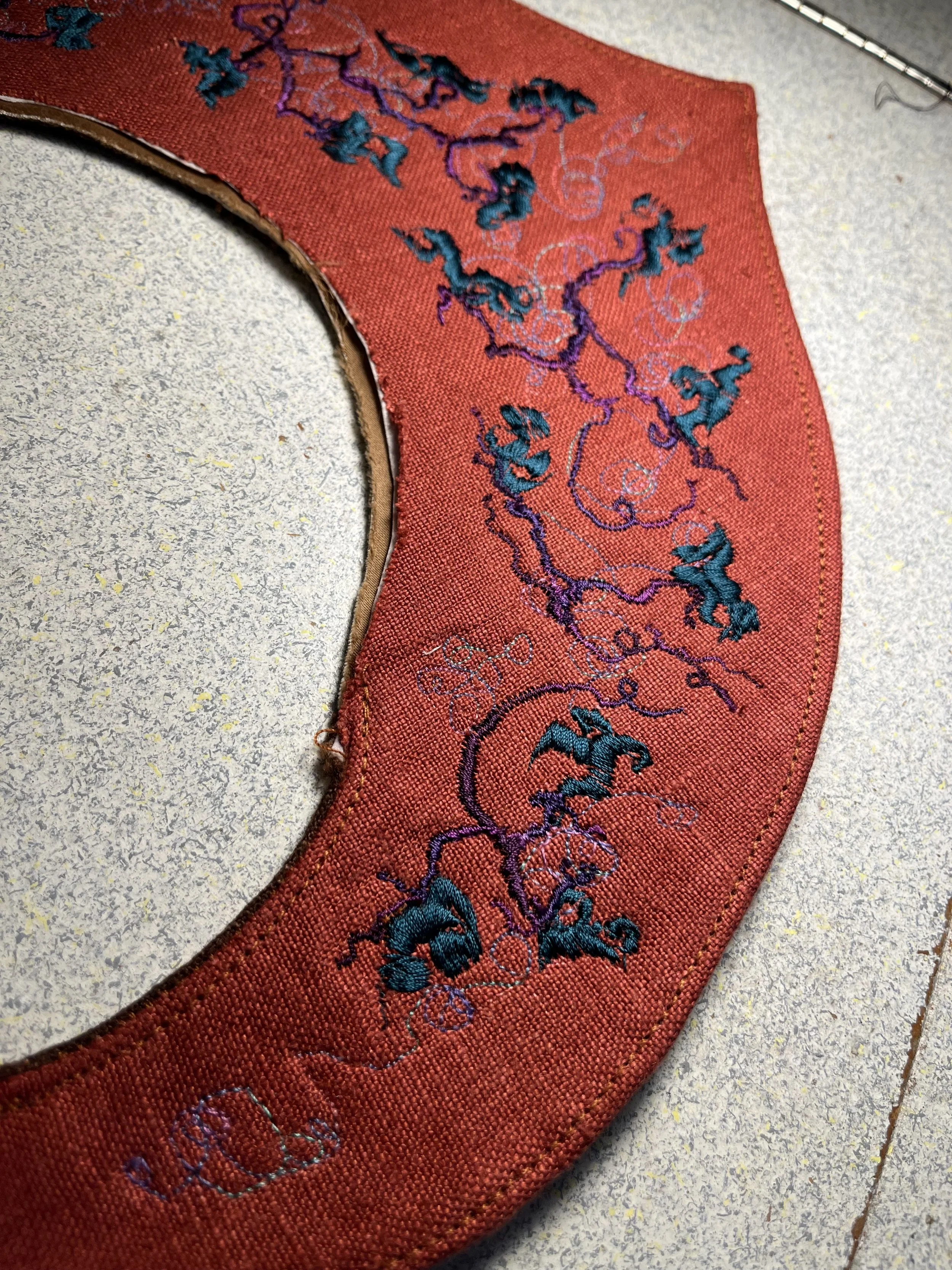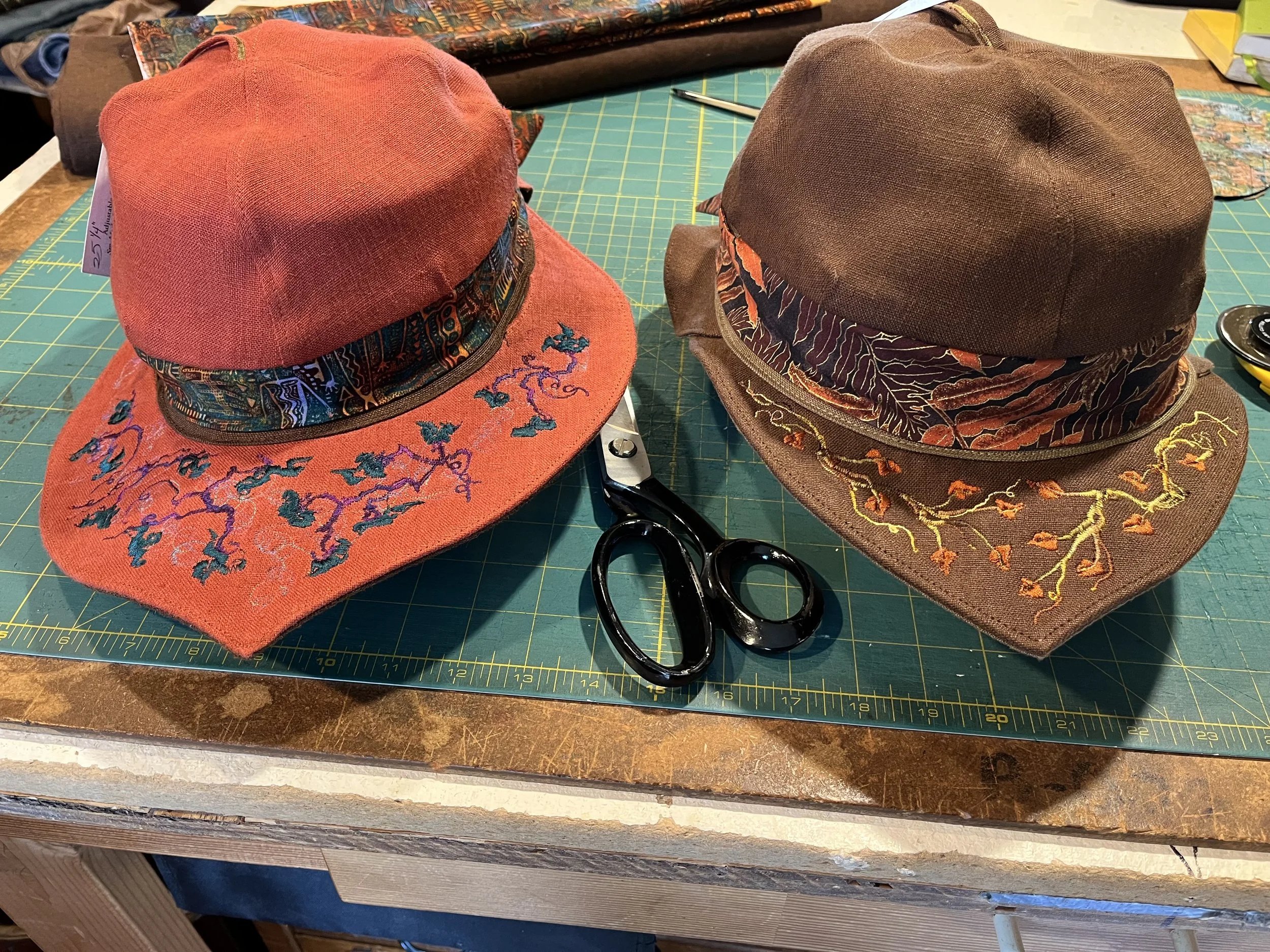There is now a central page where you can view the diverse possibilities of Leaf Corps Hats. Click the link entitled The Leaf Corps to view the page, or find the same link on the Inspired Designs page. It is so great to finally have a cornerstone presence for The Leaf Corps online! Meanwhile, in the studio, my father’s original Leaf Corps’ style continues to evolve. I am so inspired by his skill as an artisan hat maker. Notice in the picture above displaying two hats, one has a new larger brim shape. This larger brim shape will remain a rare style for us, but it is available for both Summer and Winter Leaf Corps. The close up photo of the brim shows a new leaf pattern ~~leaf species if you will~~ sewing machine foot upgrade folks. It is still my Dad’s unique freehand machine embroidery stitch technique, but a little finesse goes a long way when you lean in with the right tool.