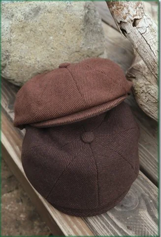 The Pendleton Wool featured in these caps is dark chocolate on one side and toffee on the other! Mind you, this does not mean the hat is reversible, you choose one color or the other. In the upper toffee colored hat you can see the dark chocolate show itself as a woven stripe. On the chocolate side the toffee is less pronounced, but still present. All of our hats are lined with cotton fabric. If you are interested in purchasing this hat, made special order exact to your size, please read the entire order form below before proceeding.