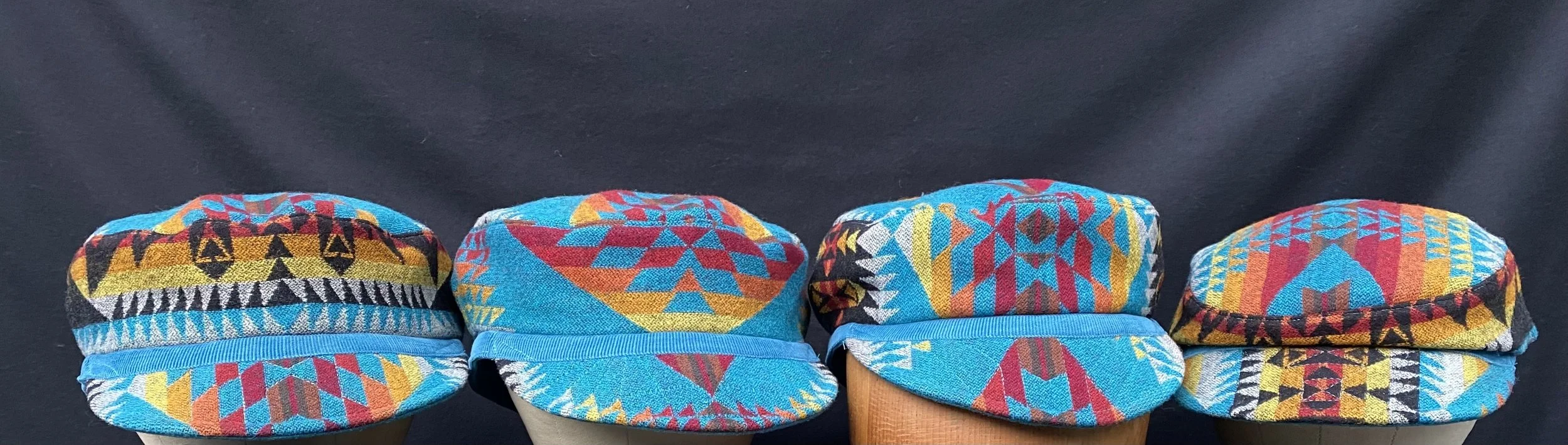 This flannel weight Pendleton Wool transforms from yellow to turquoise, to light brown, to medium brown; all while maintaining a charcoal through-line of diamond pattern. The effect in a Touring Cap is a mandala pattern when viewed from above, with the button at its center. The effect as a Sports Cap varies dramatically, mattering on the color of the ombre in the hat’s upper band.