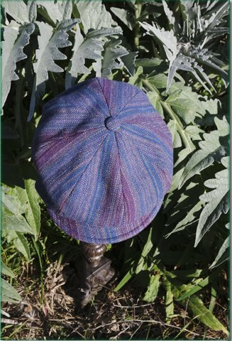This unique flannel weight Dorr Wool Herringbones fades between a whole spectrum of purple, turquoise, and blue, all on a vertical axis. If ordering this fabric as a Sports Cap, I recommend a lower band of narrow wale cotton corduroy in blue or purple.